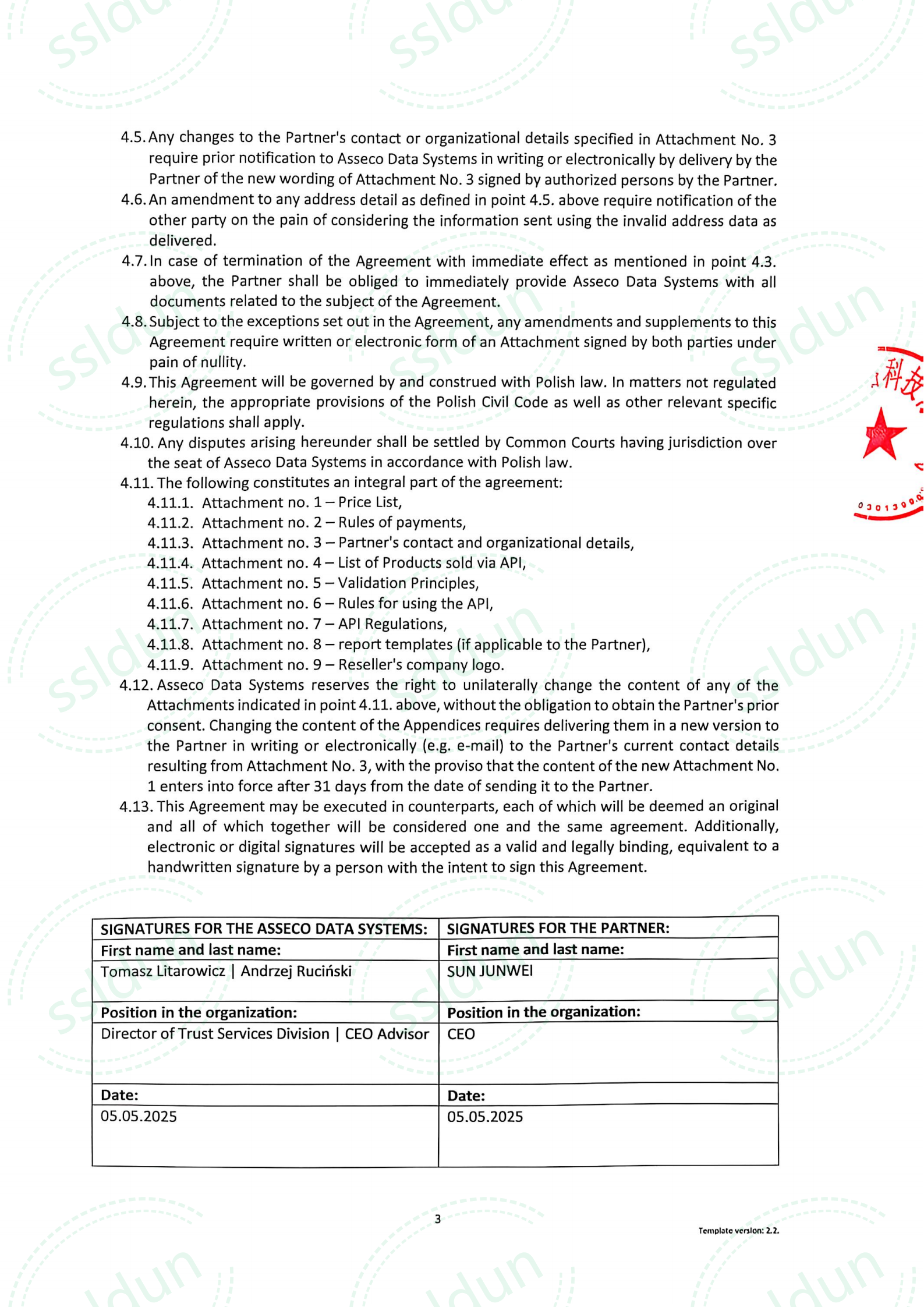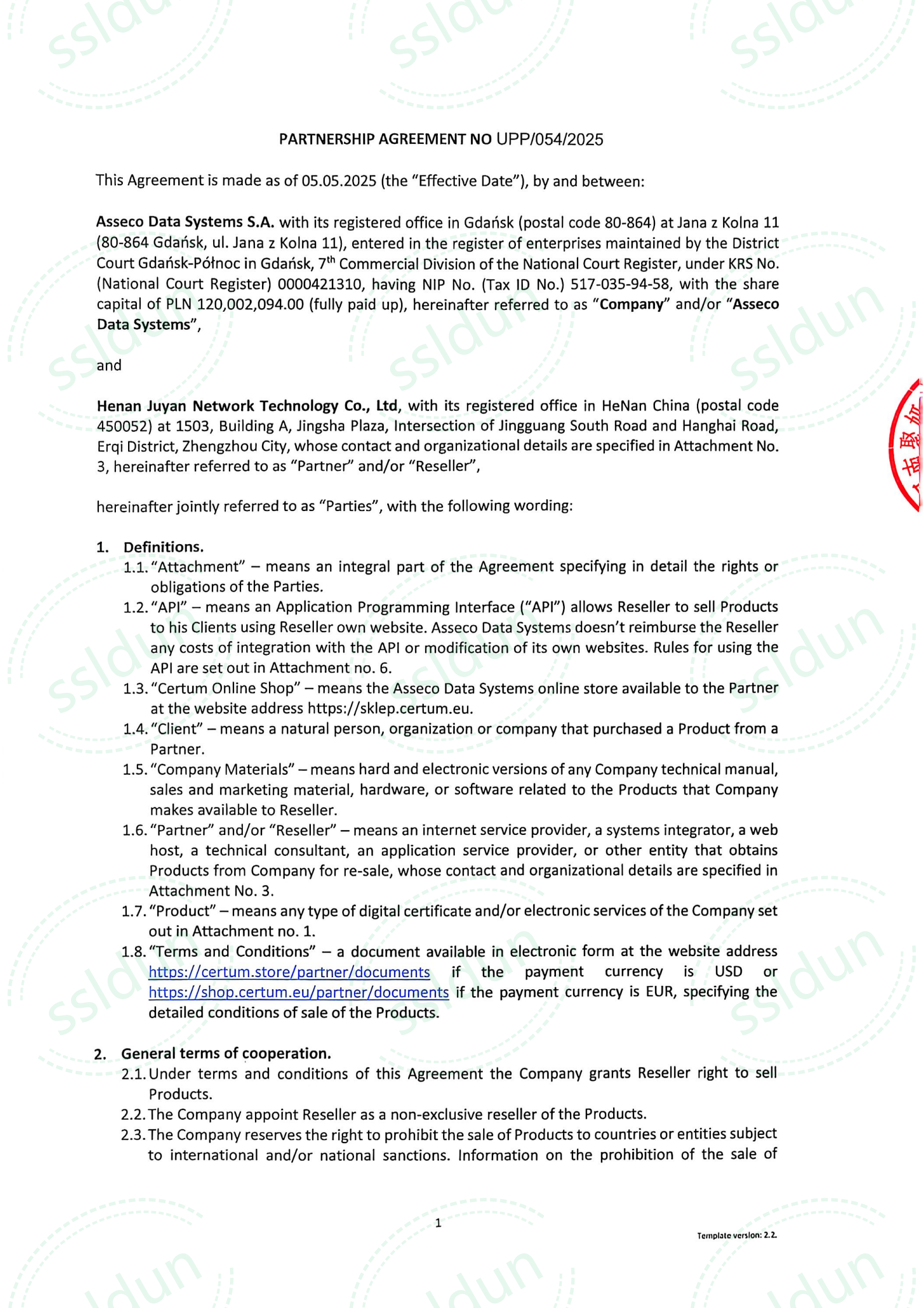 河南聚妍网络科技有限公司(成立于2016年,旗下品牌ssldun创立于2020年),以下是ssldun与certum、sectigo、globalsign授权协议部分截图,仅供参考