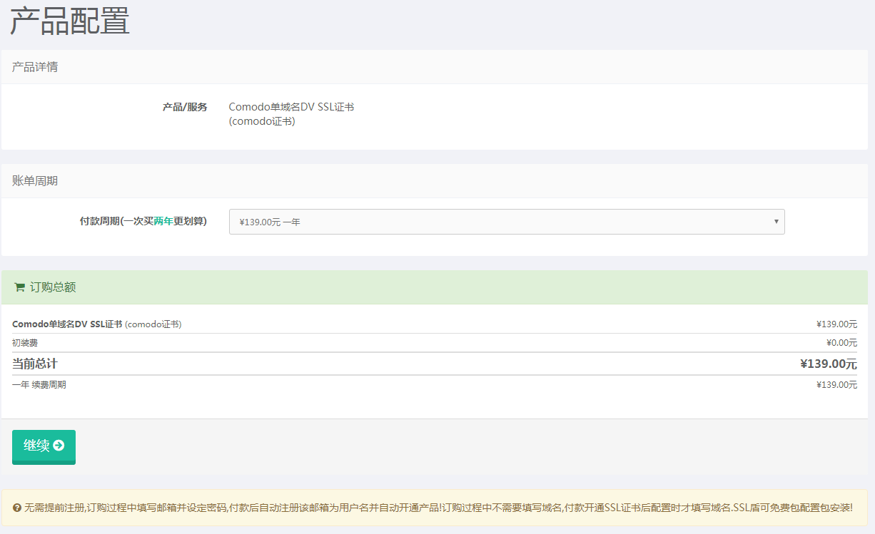 1.选择要订购的产品,以comodo单域名dv证书为例,点立即购买